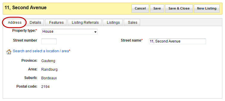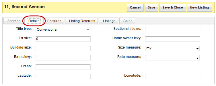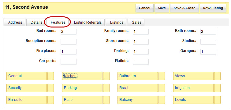 The features tab allows the agent to add most feature that the property being listed has, these item will help to identify what a buyer is looking for. |